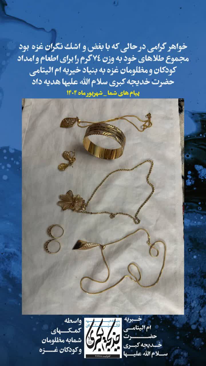 خواهر گرامی درحالی که با بغض و اشک نگران غزه بود مجموع طلاهای خود به وزن ۷۴ گرم را برای اطعام و امداد کودکان و مظلومان غزه به بنیاد خیریه امالیتامی حضرت خدیجه کبری سلام الله عليها هدیه داد