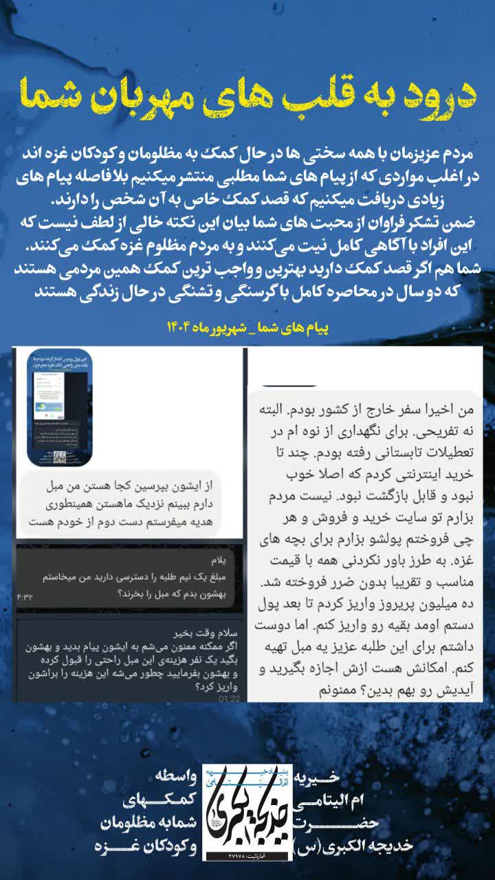 ضمن تشکر فراوان از محبت های شما بیان این نکته خالی از لطف نیست که این افراد با آگاهی کامل نیت میکنند و به غزه کمک میکنند. شما هم اگر قصد کمک دارید بهترین و واجب ترین کمک همین مردم غزه هستند که دو سال در محاصره اند