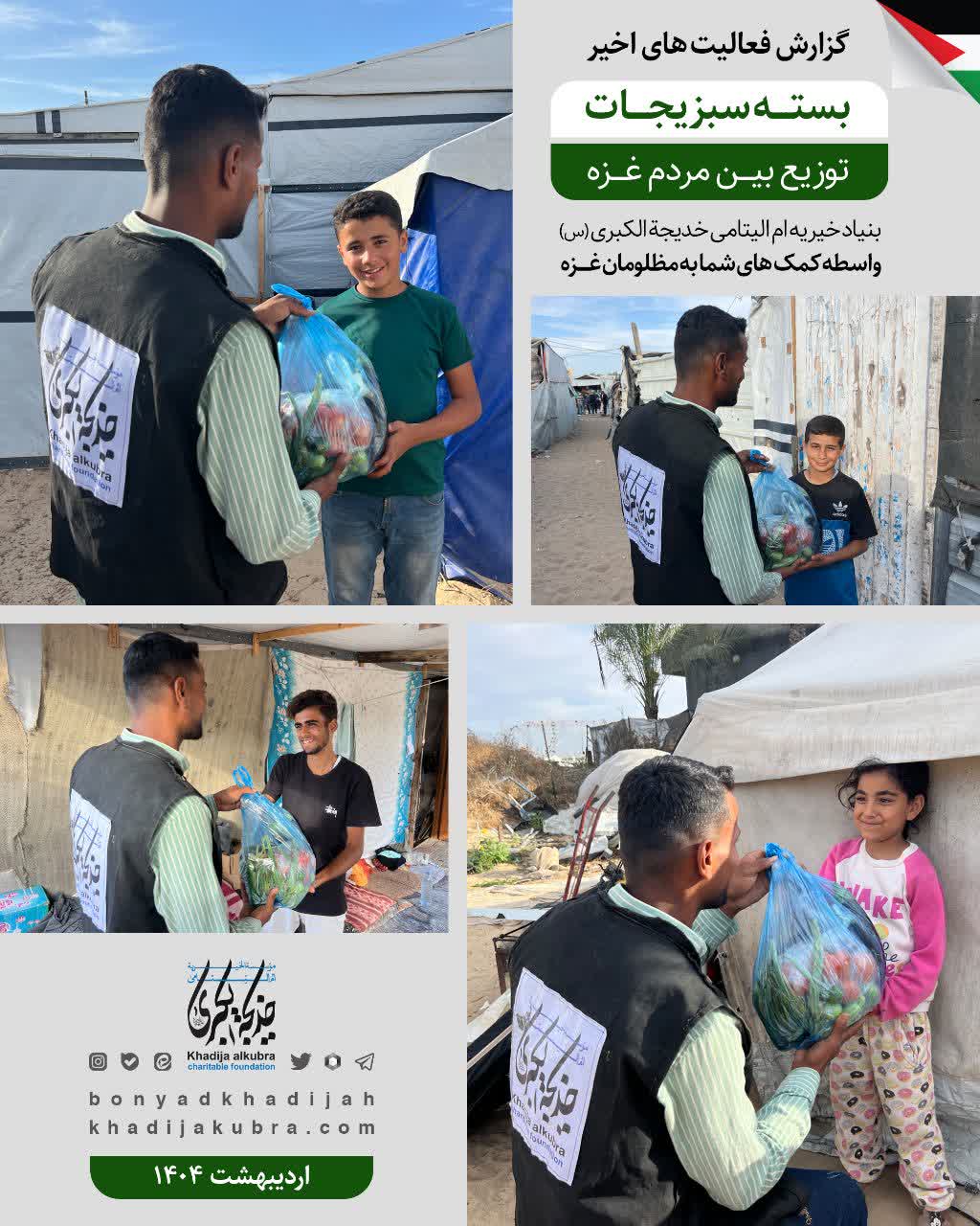 اطعام (غذای گرم)، توزیع آب سالم، سبزیجات و نان توسط بنیاد خیریه ام‌الیتامی خدیجة الکبری علیها‌السلام در غزه در حال انجام است.