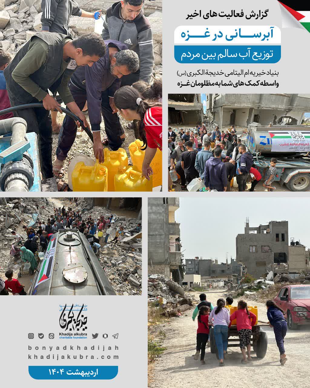 اطعام (غذای گرم)، توزیع آب سالم، بسته سبزیجات و نان توسط بنیاد خیریه ام‌الیتامی خدیجة الکبری علیها‌السلام در غزه در حال انجام است.