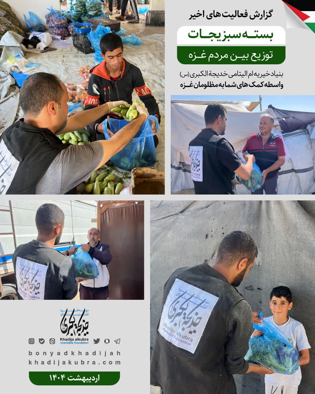 اطعام (غذای گرم)، توزیع آب سالم، سبزیجات و نان توسط بنیاد خیریه ام‌الیتامی خدیجة الکبری علیها‌السلام در غزه در حال انجام است.