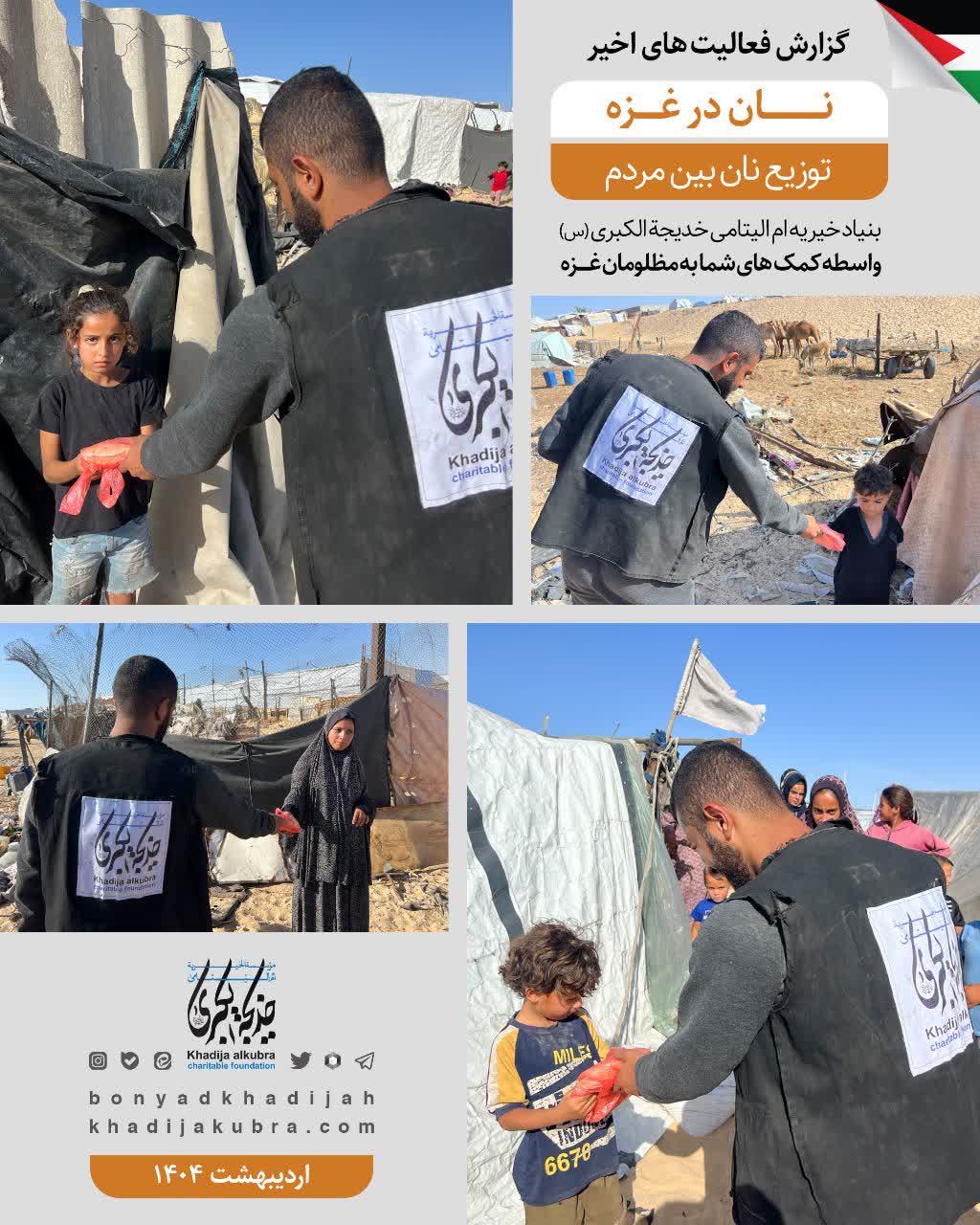 اطعام (غذای گرم)، توزیع آب سالم، سبزیجات و نان توسط بنیاد خیریه امالیتامی خدیجة الکبری علیهاالسلام در غزه در حال انجام است.
