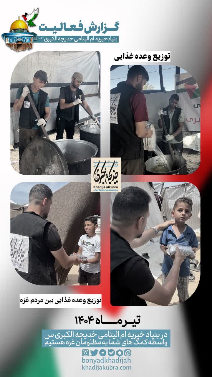 اطعام (غذای گرم)، توزیع آب سالم، بسته سبزیجات و نان توسط بنیاد خیریه ام‌الیتامی خدیجة الکبری علیها‌السلام، در غزه در حال انجام است.