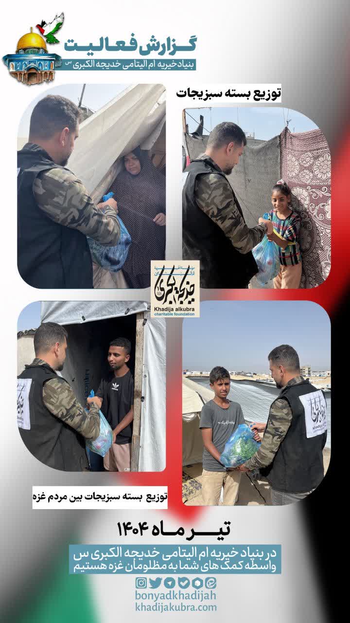 اطعام (غذای گرم)، توزیع آب سالم، بسته سبزیجات و نان توسط بنیاد خیریه ام‌الیتامی خدیجة الکبری علیها‌السلام در غزه در حال انجام است.
