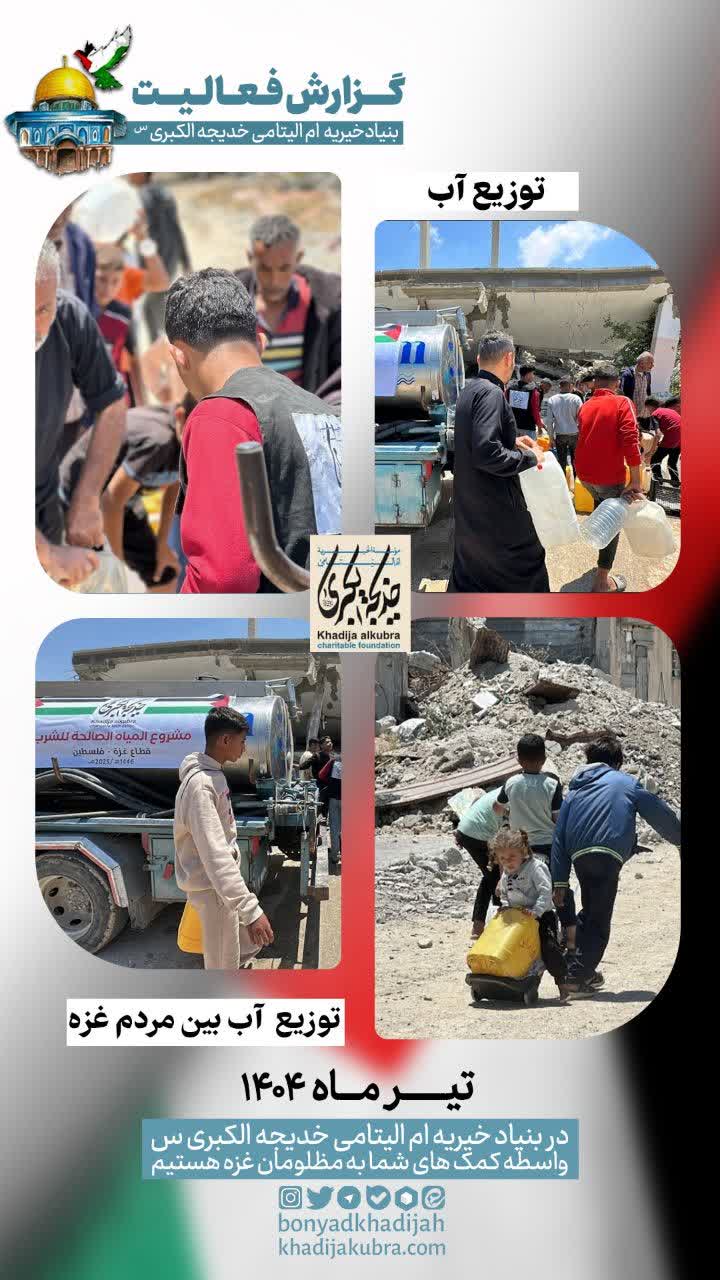 اطعام (غذای گرم)، توزیع آب سالم، بسته سبزیجات و نان توسط بنیاد خیریه امالیتامی خدیجة الکبری علیهاالسلام در غزه در حال انجام است.