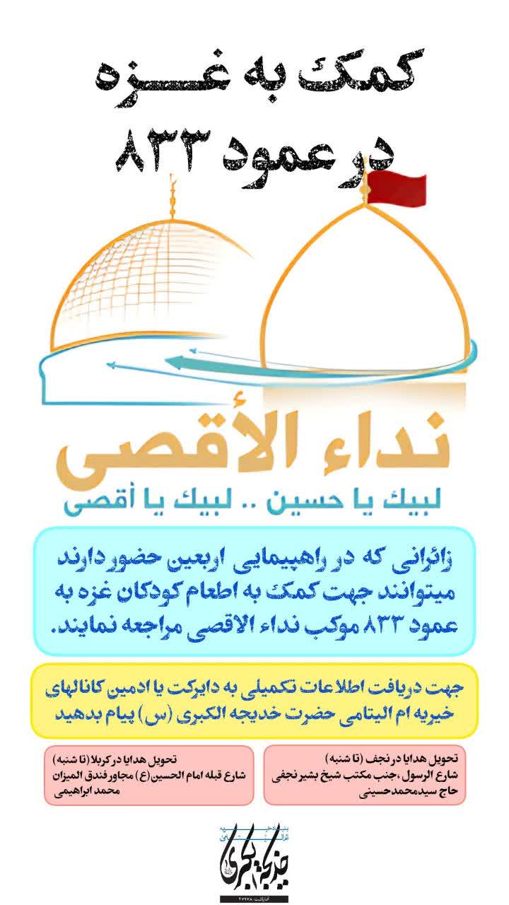 زائرانی که در راهپیمایی اربعین حضور دارند میتوانند جهت کمک به اطعام کودکان غزه به عمود ۸۳۳ موکب نداء الاقصی مراجعه نمایند.
