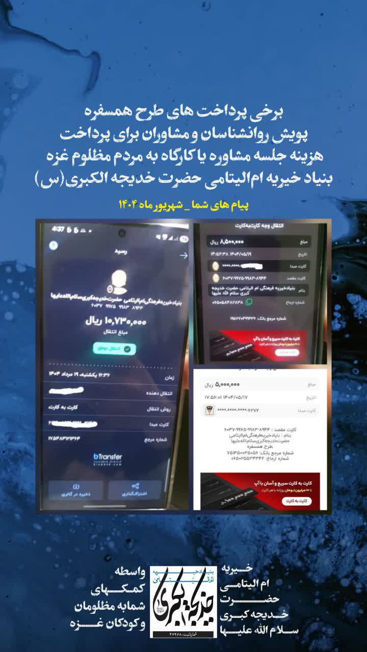 همه حسابها به نام بنیاد خیریه امالیتامی حضرت خدیجه کبری سلام الله علیها هستند.