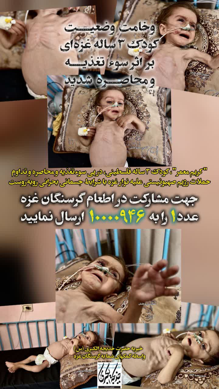 کریم معمر کودک ۳ ساله فلسطینی، در پی سوء تغذیه و محاصره و تداوم حملات رژیم صهیونیستی علیه نوار غزه با شرایط جسمانی بحرانی روبه روست
