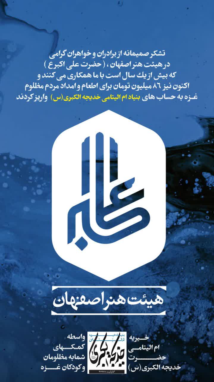 تشکر صمیمانه از برادران و خواهران گرامی در هیئت هنر اصفهان ، ( حضرت علی اکبر ع) که بیش از یک سال است با ما همکاری می‌کنند و اکنون نیز ۸۶ میلیون تومان برای اطعام و امداد مردم مظلوم غزه به حساب های بنیاد ام الیتامی خدیجه کبری(س) واریز کردند