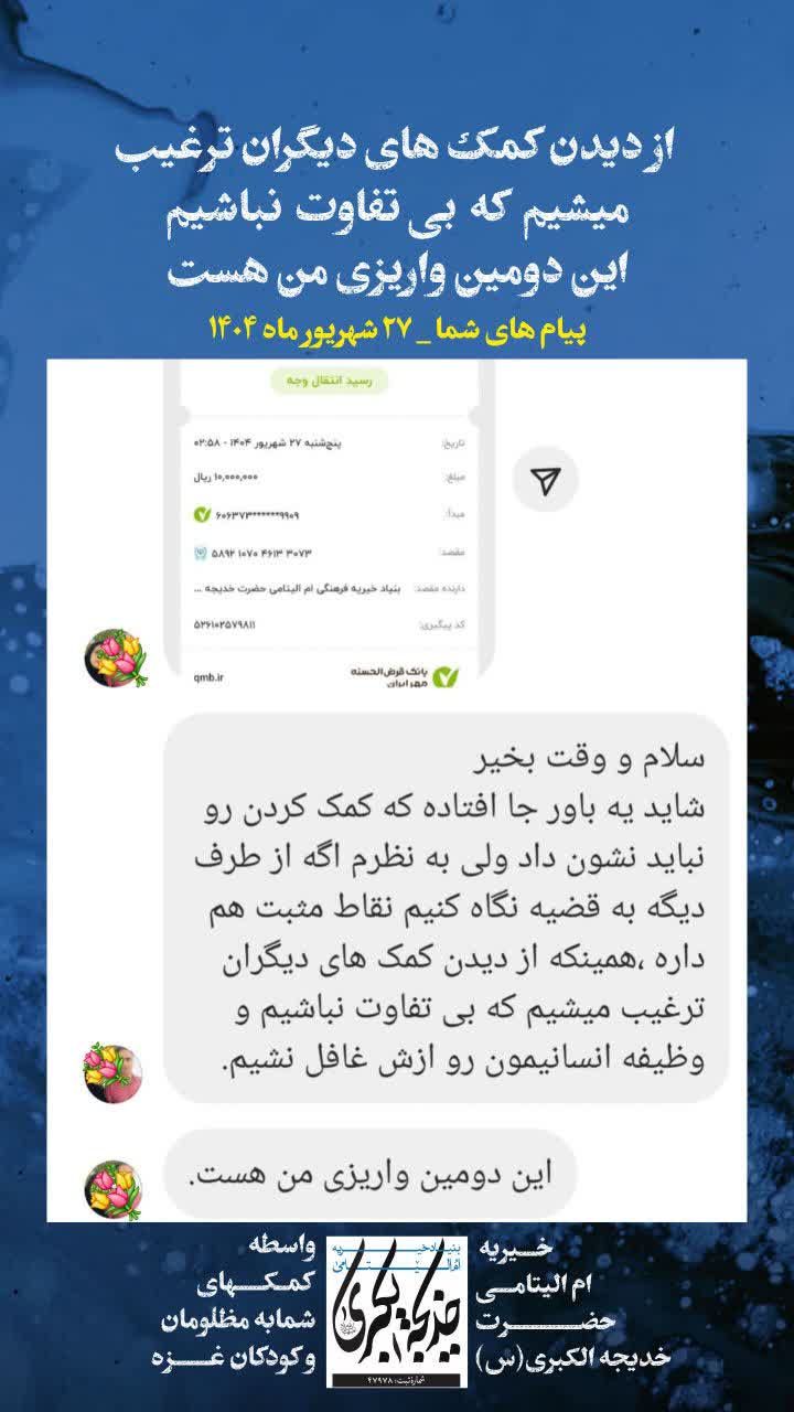1) انتقال وجه بین بانکی از طریق شماره شبا بنیاد ام الیتامی خدیجه کبری سلام الله علیها