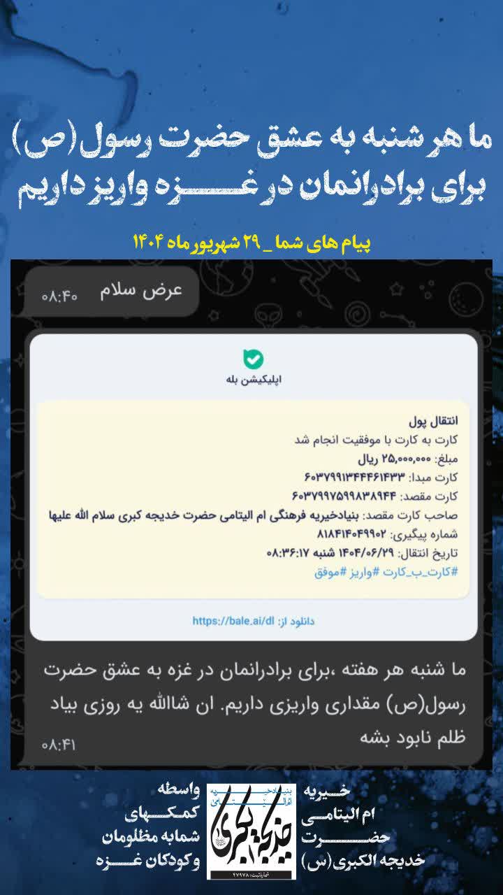 ما هر شنبه به عشق حضرت رسول(ص) برای برادرانمان در غزه واریز داریم