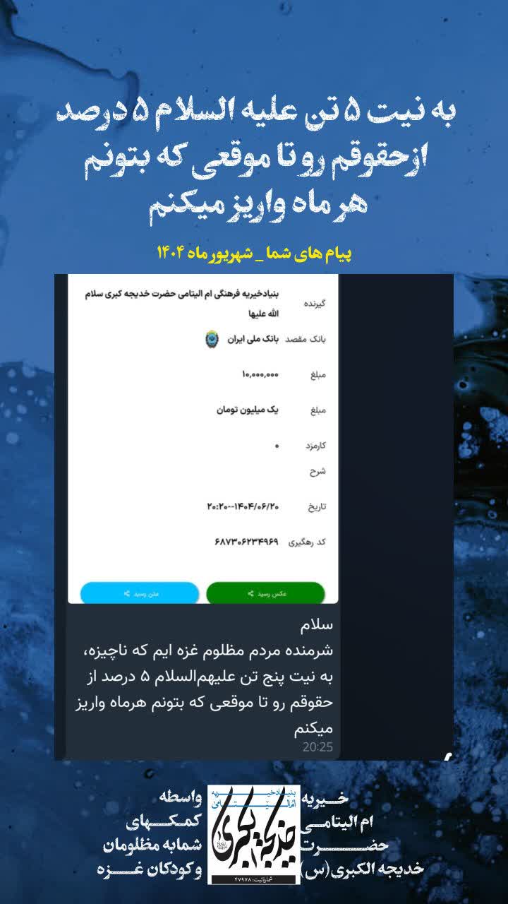 به نیت ۵تن علیه السلام ۵ درصد از حقوقم رو تا موقعی که بتونم هرماه واریز میکنم