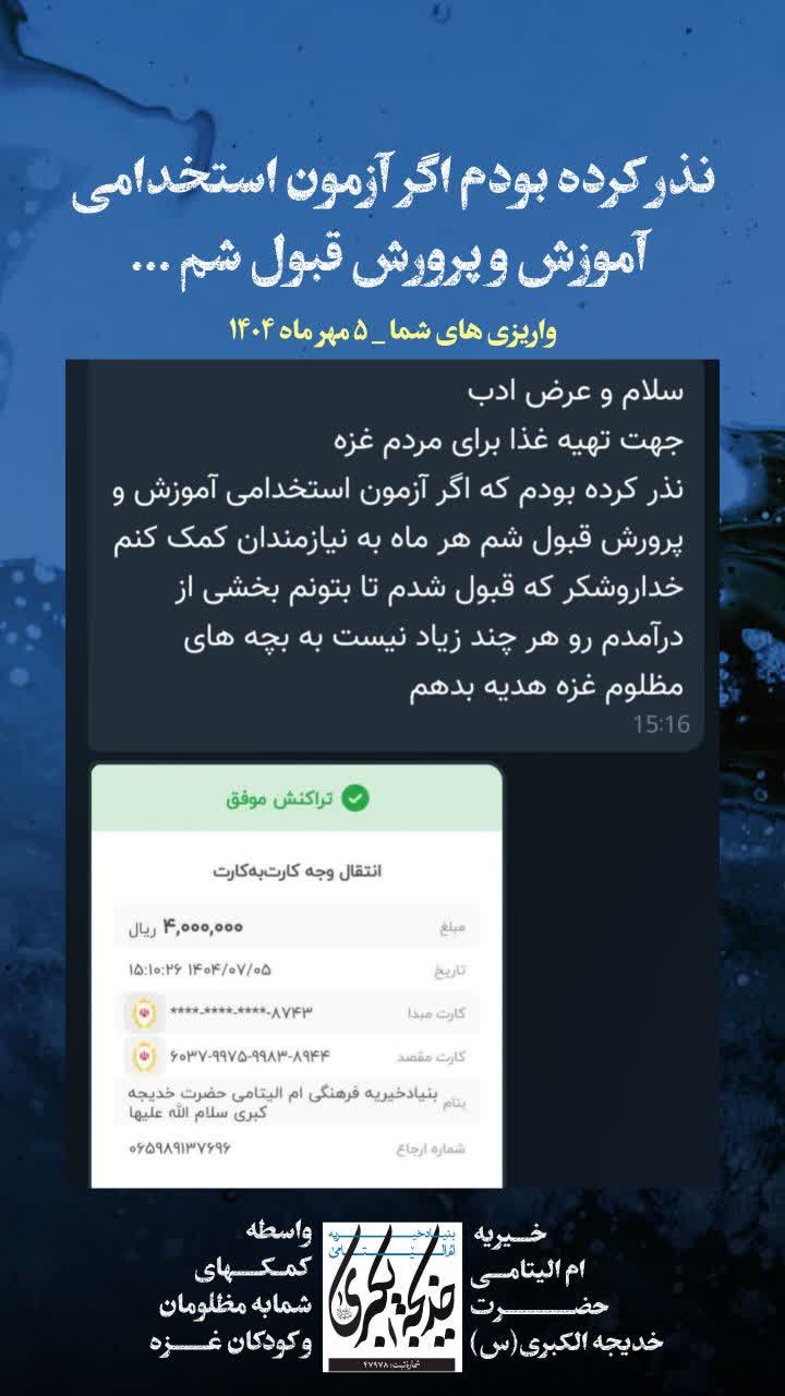 همه حساب‌ها به نام بنیاد خیریه ام‌الیتامی حضرت خدیجه کبری سلام الله علیها هستند.