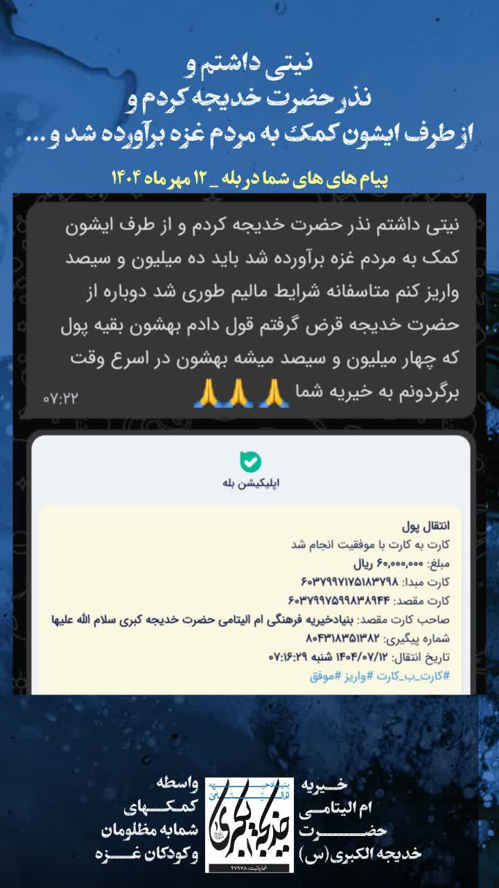 نیتی داشتم و نذر حضرت خدیجه کردم و از طرف ایشون کمک به مردم غزه برآورده شد و …