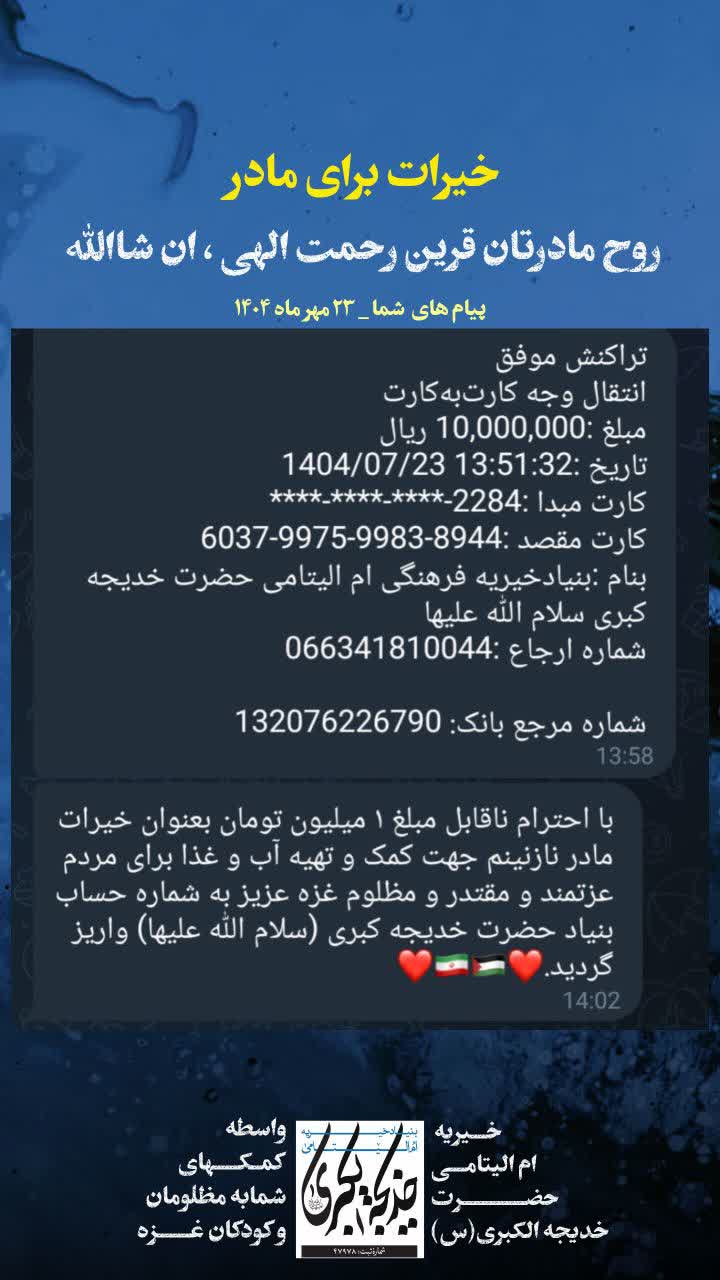 همه حسابها به نام بنیاد خیریه امالیتامی حضرت خدیجه کبری سلام الله علیها هستند.