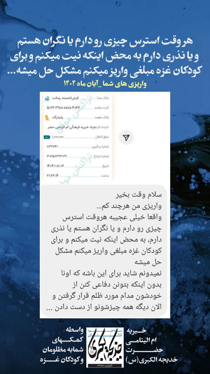 هروقت استرس چیزی رو دارم یا نگران هستم و یا نذری دارم به محض اینکه نیت میکنم و برای کودکان غزه مبلغی واریز میکنم مشکل حل میشه…