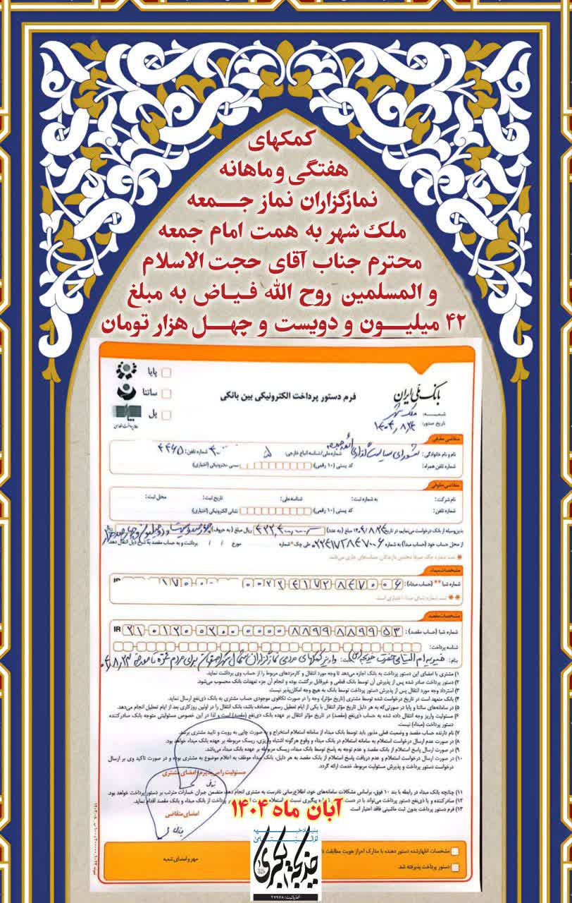 کمک های هفتگی و ماهانه نمازگزاران نماز جمعه ملک شهر به همت امام جمعه محترم جناب حجت الاسلام والمسلمین روح الله فیاض به مبلغ ۴۲ میلیون و دویست و چهل هزار تومان
