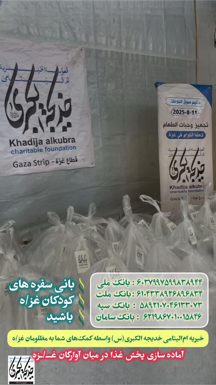 اطعام (غذای گرم)، توزیع آب سالم، بسته سبزیجات و نان توسط بنیاد خیریه امالیتامی خدیجة الکبری علیهاالسلام در غزه در حال انجام است.