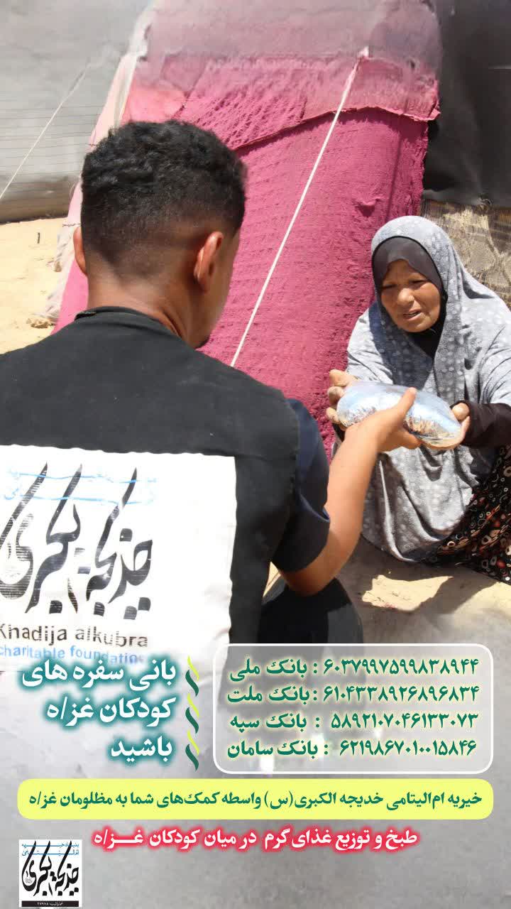 اطعام (غذای گرم)، توزیع آب سالم، بسته سبزیجات و نان توسط بنیاد خیریه ام‌الیتامی خدیجة الکبری علیها‌السلام در غزه در حال انجام است.