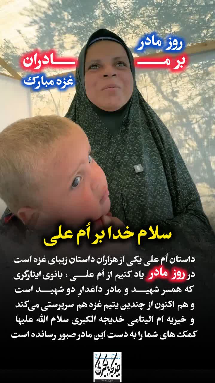 در روز مادر یاد کنیم از اُمِّ علی، بانوی ایثارگری که همسر شهید و مادر داغدار دو شهید است و هم اکنون از چندین یتیم غزه سرپرستی میکند و خیریه امالیتامی خدیجه الکبری سلاماللهعلیها کمک های شمارا به دست این مادر صبور رسانده است.