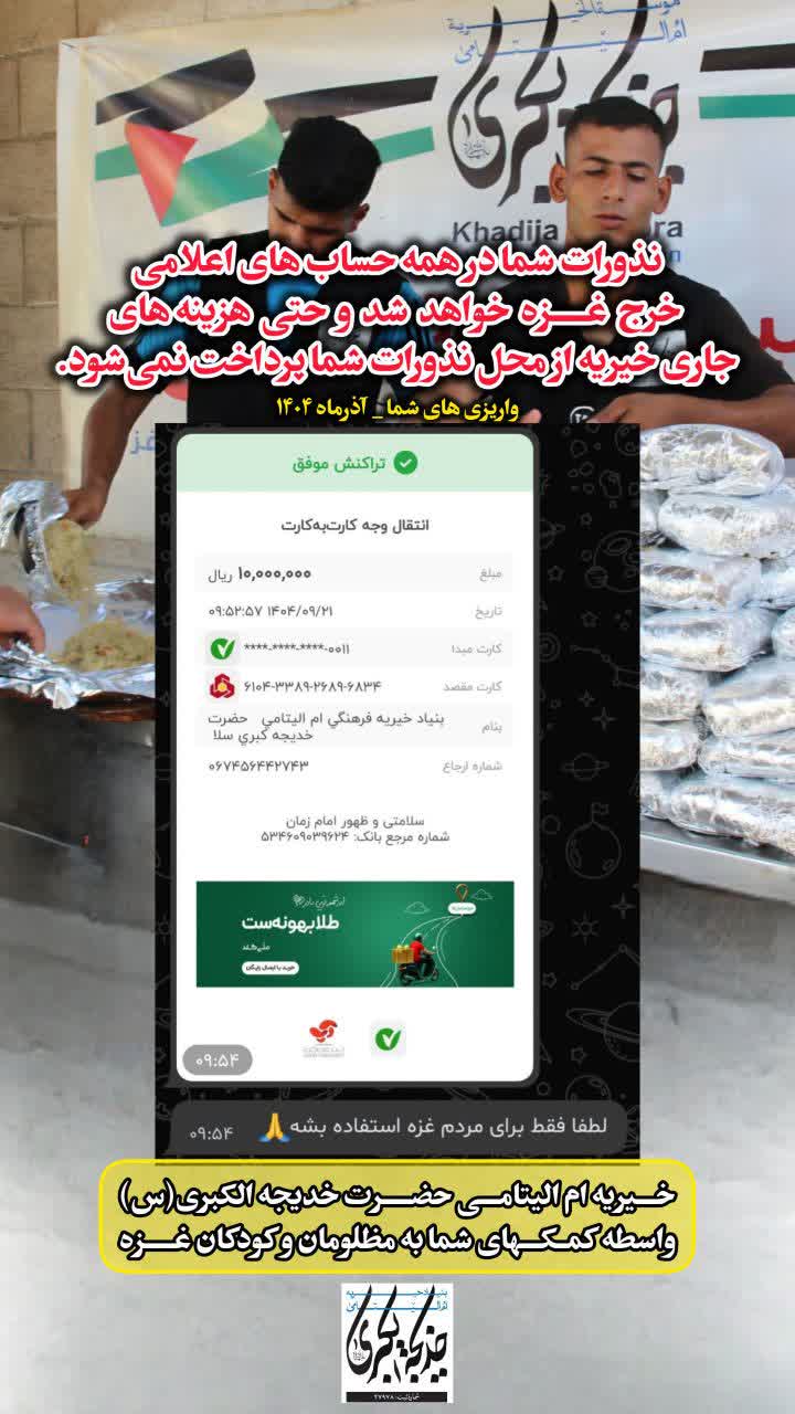 نذورات شما در همه حساب های اعلامی خرج غزه خواهد شد و حتی هزینه های جاری خیریه از محل نذورات شما پرداخت نمیشود