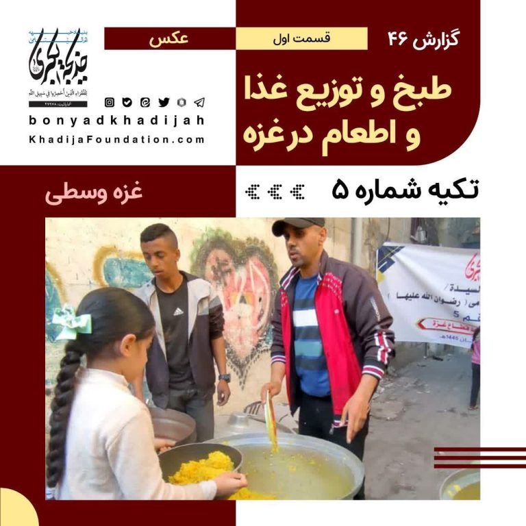 بأذن الله توسط بنیاد ام الیتامیٰ خدیجة الکبری از بيست بهمن ١٤٠٢ تا كنون، بدون وقفه، هر روز در ۵ تکیه در نقاط مختلف از جنوب تا شمالِ غزّه، غذای گرم طبخ و بین آوارگان و یتیمان توزیع میشود.