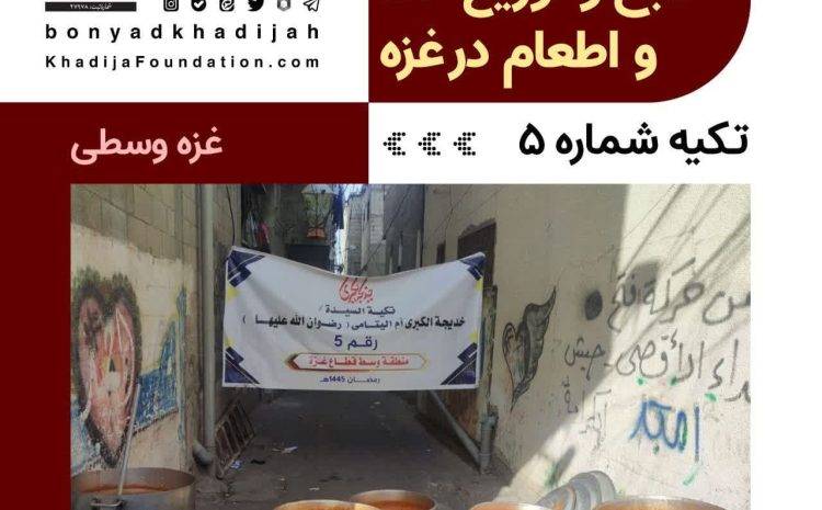 بأذن الله توسط بنیاد ام الیتامیٰ خدیجة الکبری از بيست بهمن ١٤٠٢ تا كنون، بدون وقفه، هر روز در ۵ تکیه در نقاط مختلف از جنوب تا شمالِ غزّه، غذای گرم طبخ و بین آوارگان و یتیمان توزیع می‌شود.