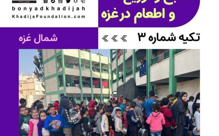 بأذن الله توسط بنیاد ام الیتامیٰ خدیجة الکبری از بيست بهمن ١٤٠٢ تا كنون، بدون وقفه، هر روز در ۵ تکیه در نقاط مختلف از جنوب تا شمالِ غزّه، غذای گرم طبخ و بین آوارگان و یتیمان توزیع می‌شود.