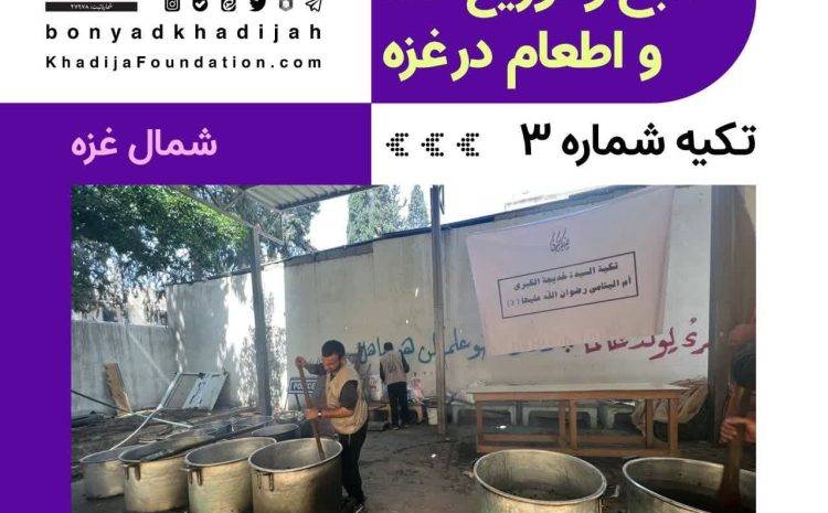 بأذن الله توسط بنیاد ام الیتامیٰ خدیجة الکبری از بيست بهمن ١٤٠٢ تا كنون، بدون وقفه، هر روز در ۵ تکیه در نقاط مختلف از جنوب تا شمالِ غزّه، غذای گرم طبخ و بین آوارگان و یتیمان توزیع می‌شود.