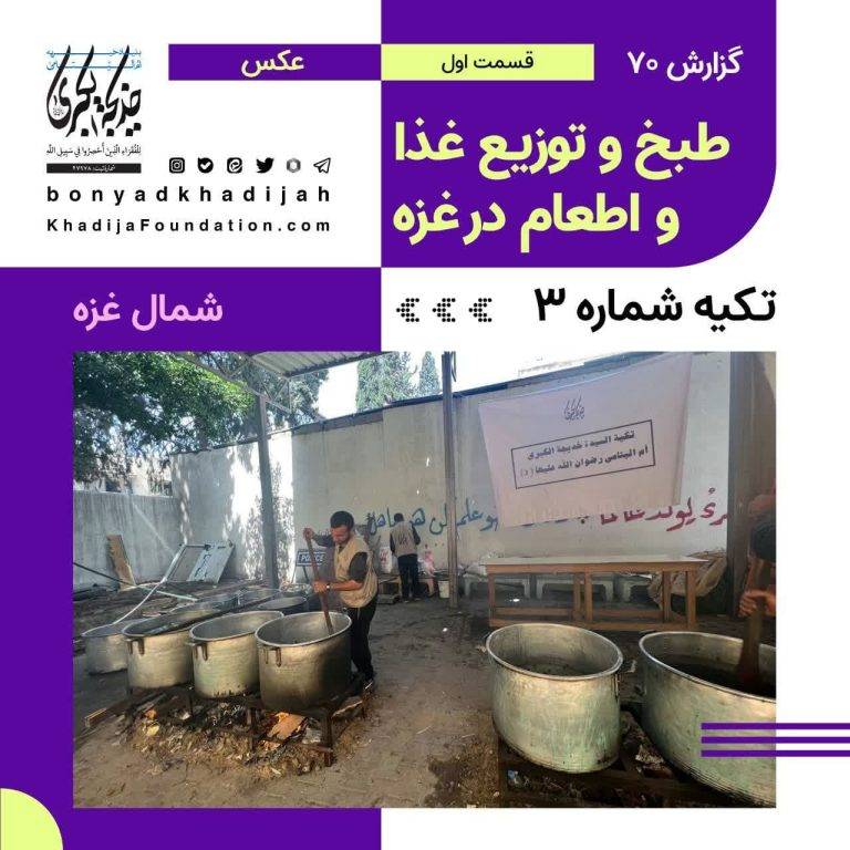 بأذن الله توسط بنیاد ام الیتامیٰ خدیجة الکبری از بيست بهمن ١٤٠٢ تا كنون، بدون وقفه، هر روز در ۵ تکیه در نقاط مختلف از جنوب تا شمالِ غزّه، غذای گرم طبخ و بین آوارگان و یتیمان توزیع می‌شود.
